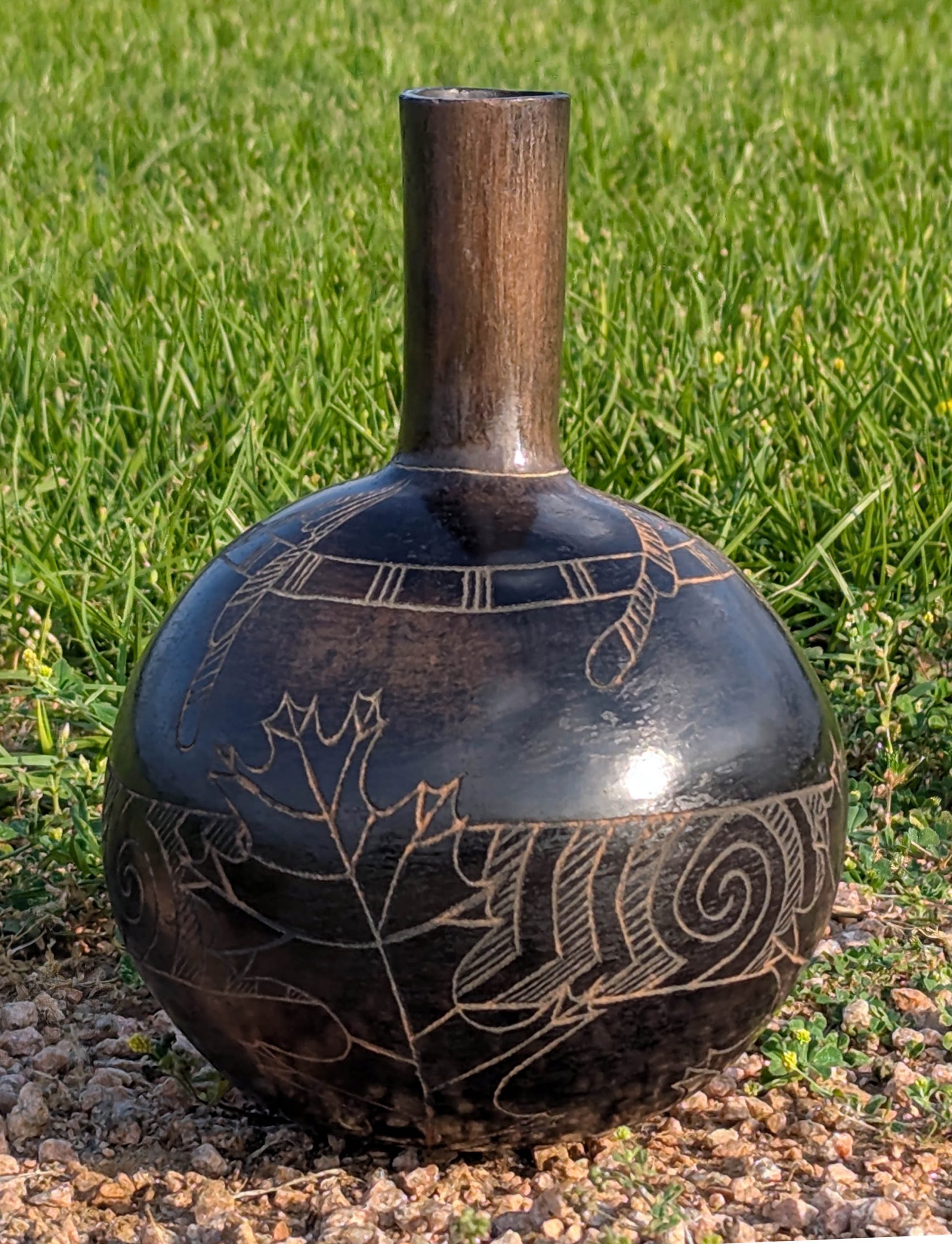 Becky Quinlan is a Caddo pottery artist living in Washington State. She creates her works in the traditional way: hand dug, hand processed clay; hand coiled and shaped; stone burnished and open pit-fired. Her etched and incised designs combine traditional themes with inspiration from the natural environment of the Caddo homelands.