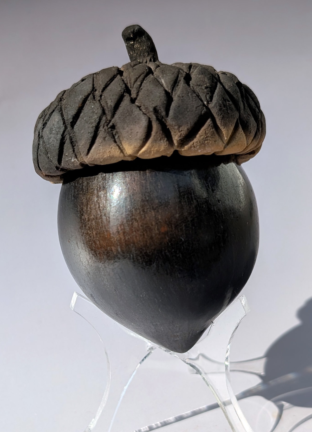 A 2-piece pot in the form of an acorn. Made of hand dug clay, the body of the pot is stone burnished and the lid and stand are incised with realistic texture and left un-burnished. Open-pit fired.