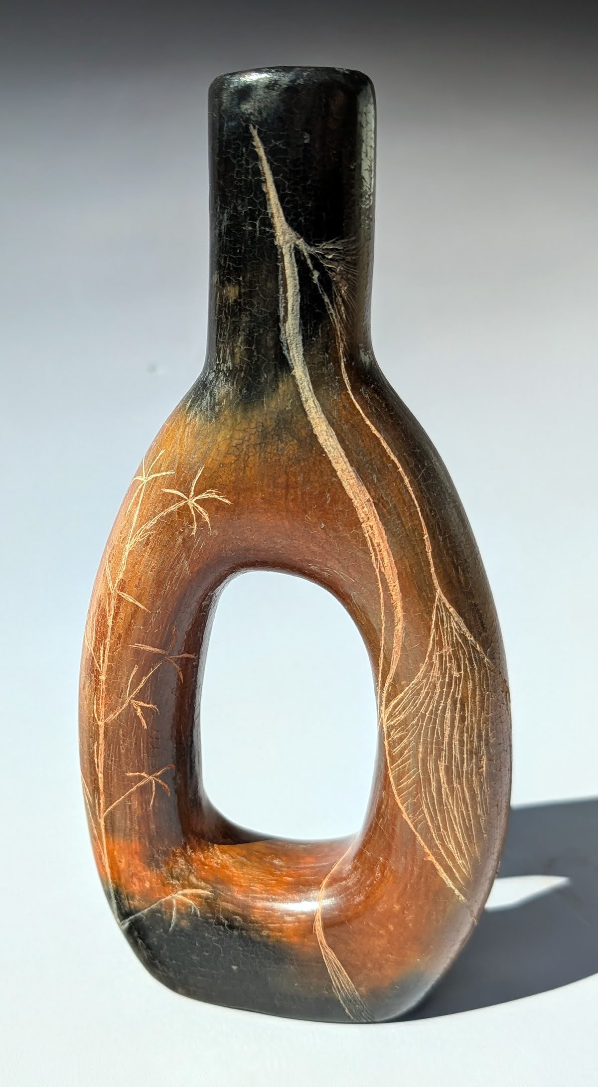 Hand-dug, hand processed clay Coil-built Burnished with a rock Open pit-fired Hand-etched