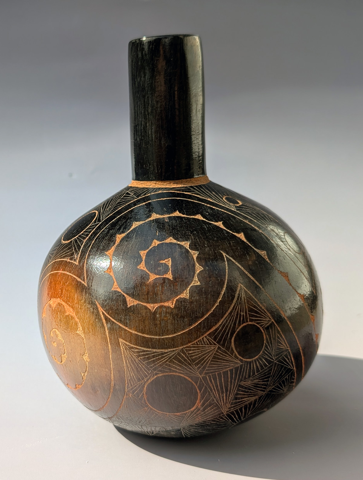 Hand-dug, hand processed clay Coil-built Burnished with a rock Open pit-fired Hand-etched