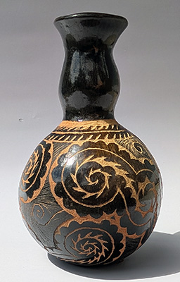 Hand-dug, hand processed clay Coil-built Burnished with a rock Open pit-fired Hand-etched
