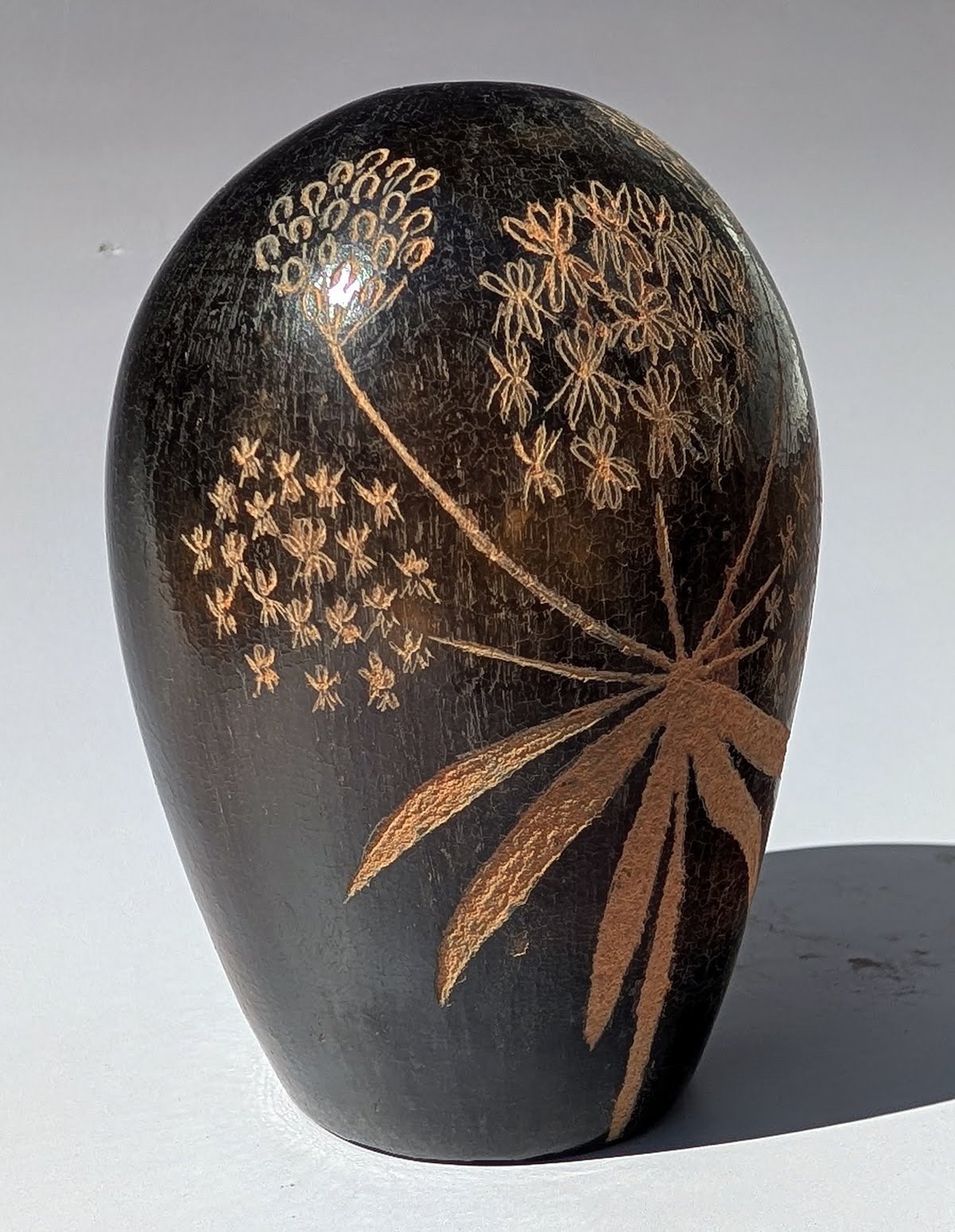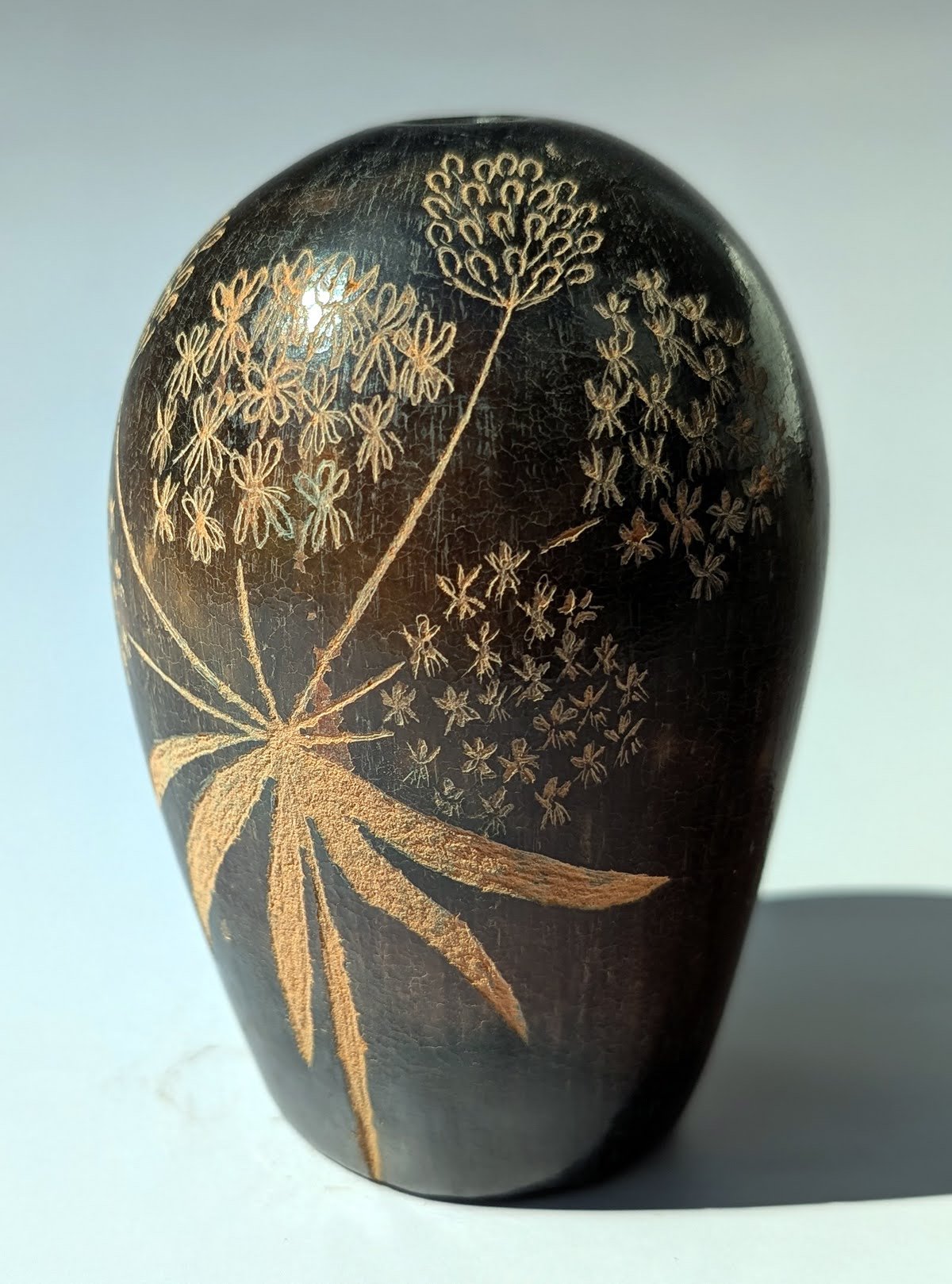 A traditional seed pot with etching of milkweed
