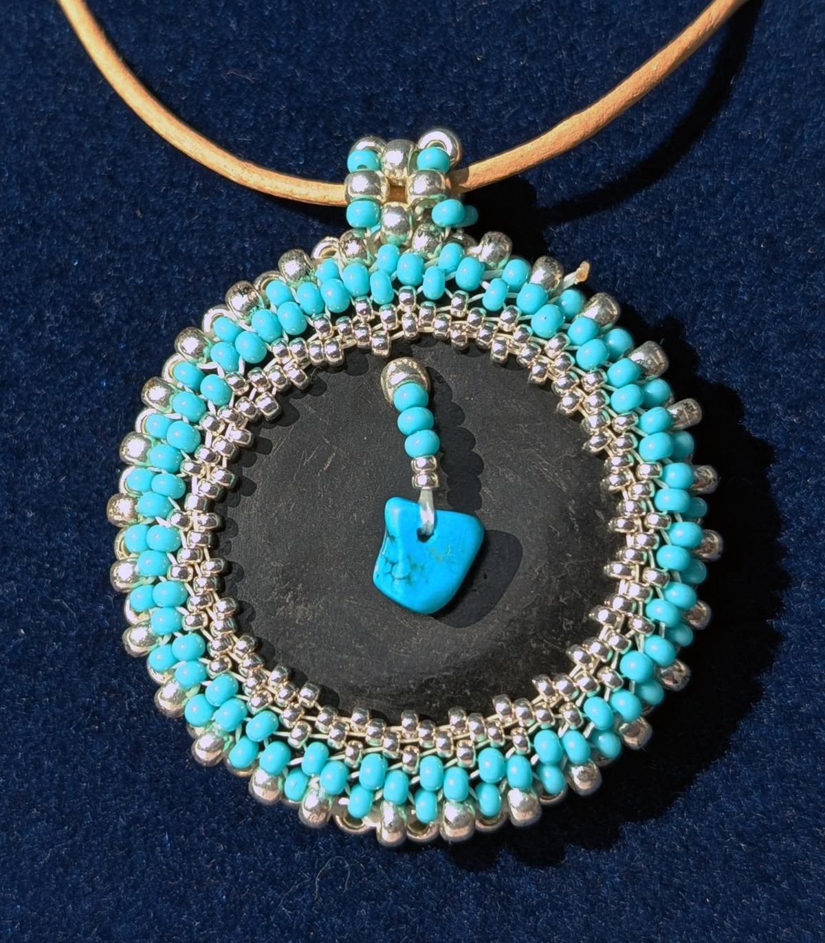 Center of hand-dug, hand processed clay, burnished with a stone and open-pit fired. Beaded bezel and bail. 19″ leather necklace.