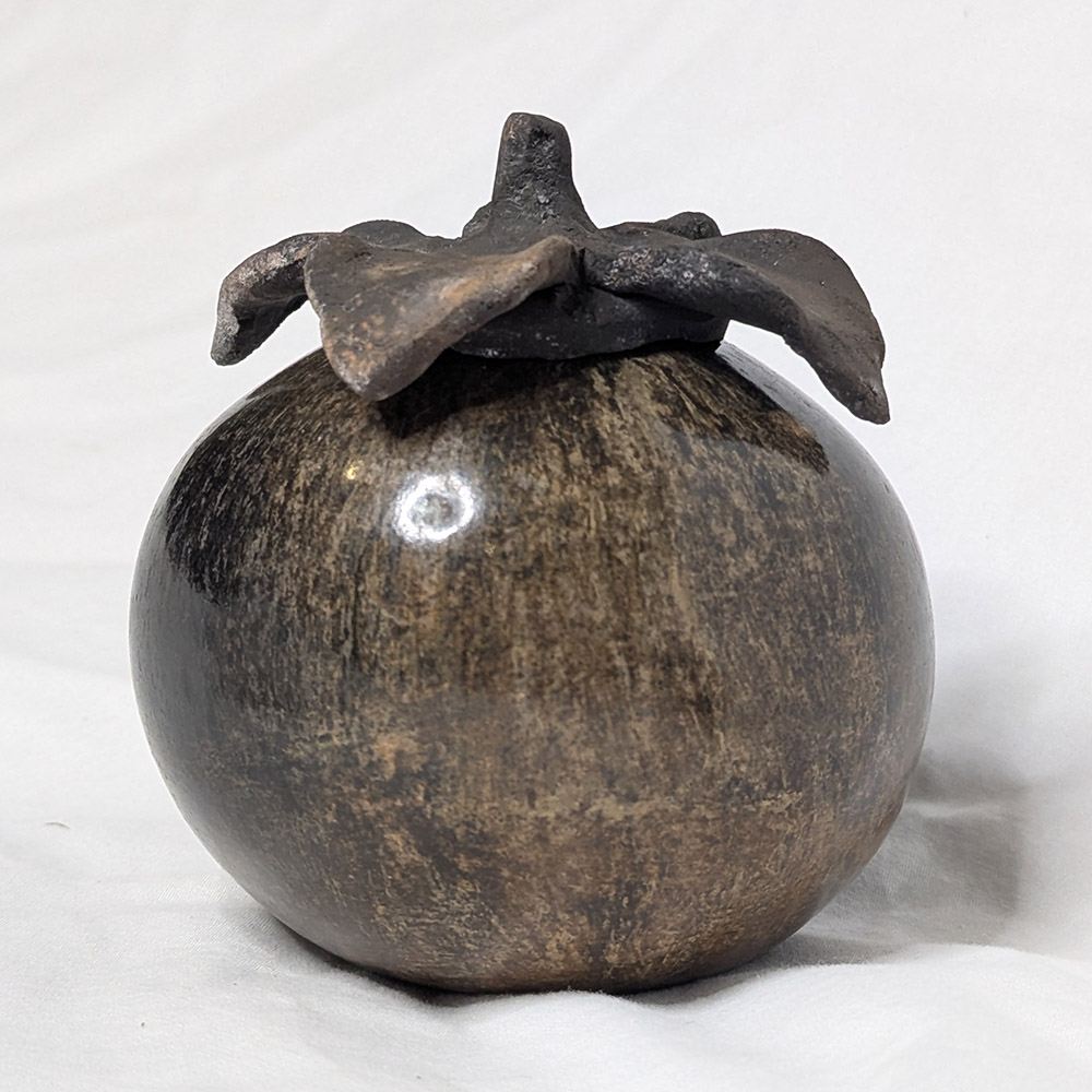 A 2 -piece pot in the form of a persimmon. Made of hand dug clay, the body of the pot is stone burnished and the lid is left un-burnished. Open-pit fired.